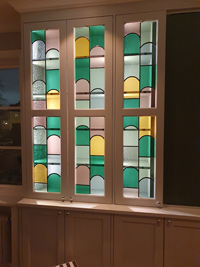 nyligen inmonterat två stycken blyinfattningar med romber i grått och ofärgat katedralglas, och ofärgade rundlar. Insynsskyddande i ett kök.