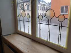 Ännu ett fönster gjort till Bååtska palatset på Blasieholmen. Denna gången en svart svan färdig att lyfta. 18/6 stort fönster med bågformer i specialfönsterglas ,precis inmonterad i den skrapade och nymålade fönsterbågen 22/2 Renoveringsarbetet fortskrider med lyckat resultat framåt 13/2