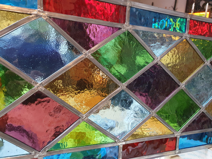 2023: Nyss inkittat blyglasfönster i munblåst antikglas i ljusa pastellnyanser,