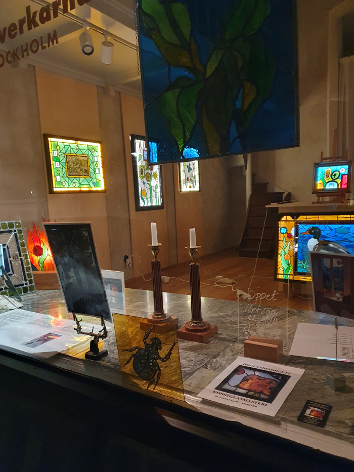 januari-februari 2024 Nyligen uppmonterat blyfönster, som skydd för insyn , men med en liten ruta i vanligt fönsterglas, som ett titthål ---------------------------------------------------------------------------------------------------------------------- Besökte nyligen Dalarnas museum och blev inspirerad av bl.a. det floristiska handarbetet. Målade denna glasskiva med metalloxid och brände in . Kanske använder jag det i någon kommande ljustavla.. Nyligen färdig med detta alster. Målade och inbrända detaljer. Stokholm Craft Week startar 4 oktober och pågår till 8 oktober. Passa gärna på och kika på häftigt konsthantverk under dessa dagar!